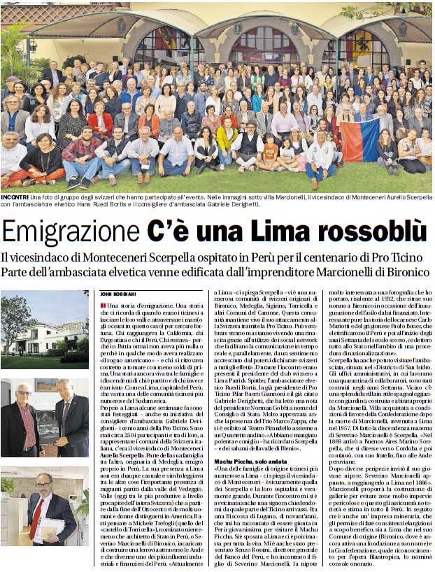 Proprio a Lima alcune settimane fa sono stati festeggiati – anche su iniziativa del consigliere d’ambasciata Gabriele Derighetti – i cento anni della Pro Ticino. Sonostati circa 250 i partecipanti e tra di loro, a rappresentare i comuni della Svizzera italiana, c’era il vicesindaco di Monteceneri Aurelio Scerpella. Parte della sua famigliatra l’altro, originaria di Medeglia, emigrò proprio in Perù. La sua presenza a Lima non era dunque casuale e simboleggiava tra le altre cose l’importante presenza di migranti partiti dalla valle del Vedeggio.Valle (oggi tra le più produttive a livello pro capite dell’intera Svizzera) che a partire dalla fine dell’Ottocento vide molti uomini e donne distinguersi in America. Basti pensare a Michele Trefogli (quello del«castello di Torricella»), nominato niente meno che architetto di Stato in Perù, o Severino Marcionelli di Bironico, incaricato di costruire una ferrovia attraverso le Ande e che divenne uno dei più influenti industrialie finanzieri del Perù.