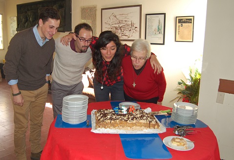 Suor Olga, junto a los jóvenes Gaia Castelli, Luca Beviacqua y Agustín Gancedo tuvieron el privilegio de soplar las simbólicas velitas de la torta.