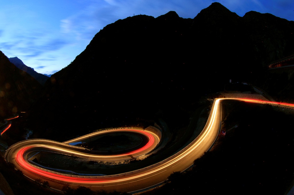 Esta interesante fotografía fue tomada con un objetivo de ojo de pez. Es la carretera del Gottardo muy concurrida durante las vacaciones de verano.