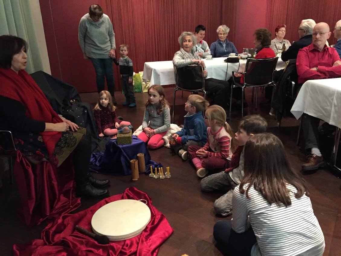 Carmela davanti agli occhi attenti e incuriositi dei bambini e dei nonni (vedi foto) ha raccontato tre avvincenti fiabe ambientate in paesi lontani a suon di tamburello e campanelle. Solo l’arrivo di Babbo Natale ha distolto i bimbi da Carmela. Babbo Natale ha colloquiato con ogni bimbo prima di distribuire le strenne. Grazie Babbo Natale!