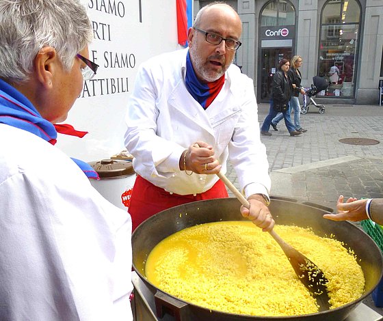La Pro Ticino di San Gallo non si è lasciata sfuggire l’occasione per cucinare e mettere in vendita un eccellente risotto, quello famoso di Orlando Ferrari e Yvette Neuenschwander-Peverelli e dietro l’angolo l’offerta di prodotti tipici del Ticino.