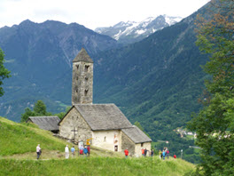 Dopo di ché, attraverso pascoli profumati di fieno e con il Monte Sosto come punto di riferimento, ci siamo incamminati verso Leontica. Da lì, seguendo la vecchia mulattiera del Nara, abbiamo raggiunto la chiesa San Carlo di Negrentino, un piccolo gioello di architettura medioevale. Quì, circondati da preziosi affreschi romanici, ci siamo concessi il piacere di cantare alcune canzoni.