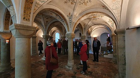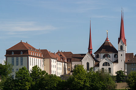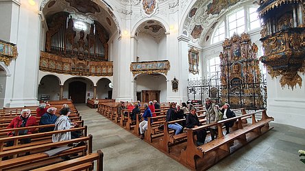 Dapprima hanno citato alcuni dettagli storici relativi al convento: dal 1027, anno di fondazione da parte degli Asburgo, fino alla monumentale costruzione visibile oggi. Nel 1841 l’ancor giovane cantone di Argovia (nuovo proprietario) chiuse il convento e la sua infrastruttura fu più tardi adibita a scuola, ospedale e casa medicalizzata. Ci hanno quindi mostrato l’originalissima chiesa di forma ottagonale, gioiello barocco con una cupola alta 20 metri, costruita alla fine del seicento sulle fondamenta dell’originale chiesa romanica.