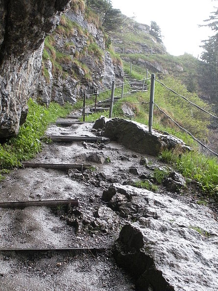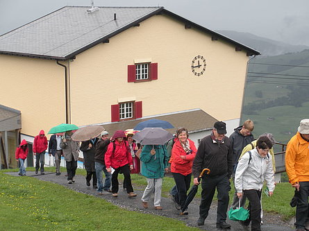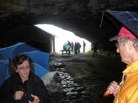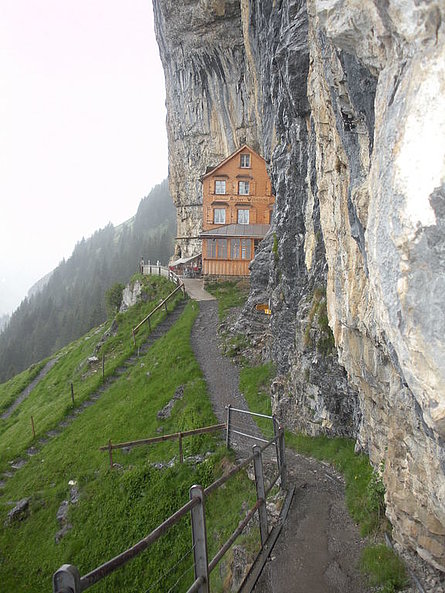 Domenica, dopo l'interessante visita all'"Heimatmuseum" di Urnäsch siamo saliti in funivia da Wasserauen sull'Ebenalp, a 1600 m. di altezza. Dopo l'ottimo pranzo, a causa del tempo purtroppo inclemente con pioggia e vento, non tutti se la sono sentita di fare la camminata in programma. Con l'assistenza di esaurienti spiegazioni di due guide - pure loro carine e gentili - si è potuto ammirare lungo la parete a strapiombo l'imponente "Bärenhöhle" (dove furono trovati gli scheletri di 900 orsi di montagna che sull'arco di 19'000 anni finirono lì dentro i loro giorni), la Wildchirchli (chiesetta ricavata da una grotta) e il famoso Ristorante Aescher, appiccicato alla parete rocciosa come un nido d'aquila. Per chi ha avuto il necessario coraggio questa "esplorazione" è senz'altro valsa il disagio delle "braghe" intrise d'acqua piovana. Con un ultimo sguardo alle colline e montagne appenzellesi, con i loro piccoli "Buurehöfli", quasi tutti con le stalle colorate per lo più di giallo a indicarne i proprietari cattolici, siamo risaliti sul torpedone e messi sulla via del ritorno.