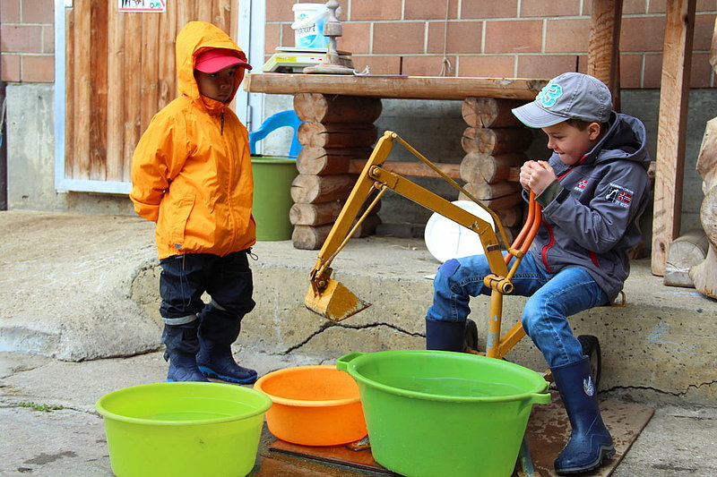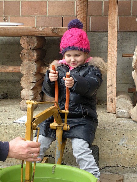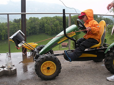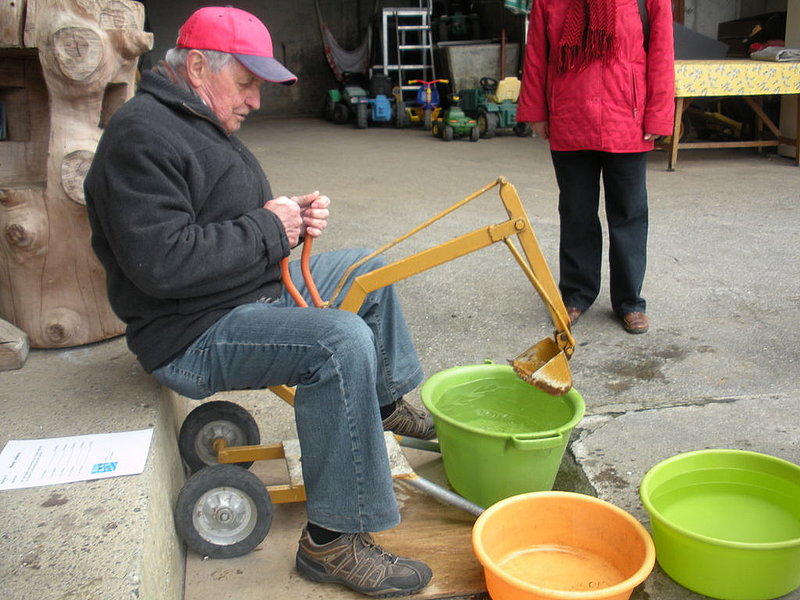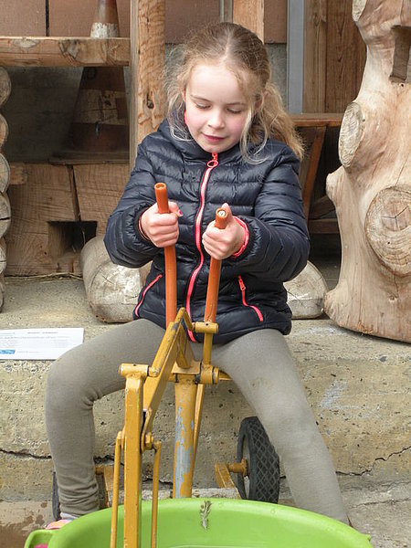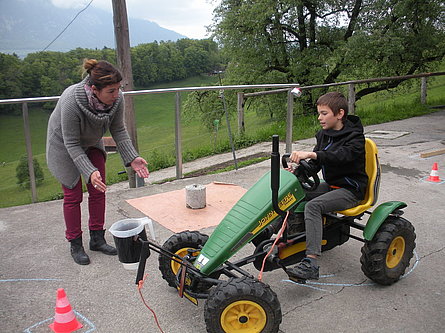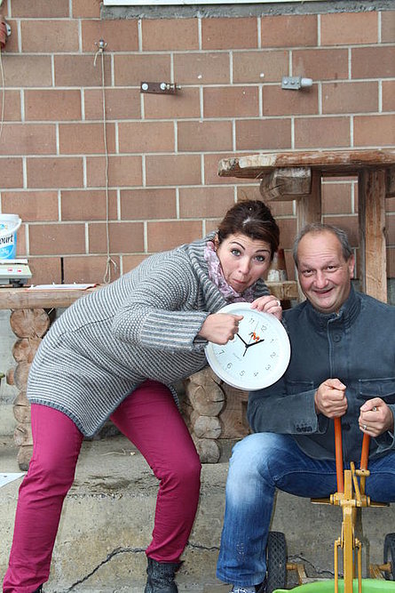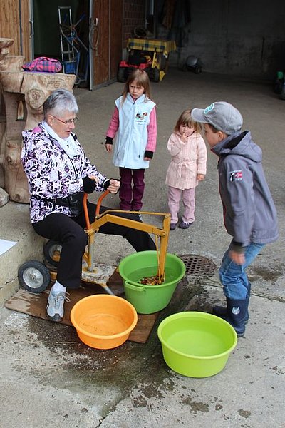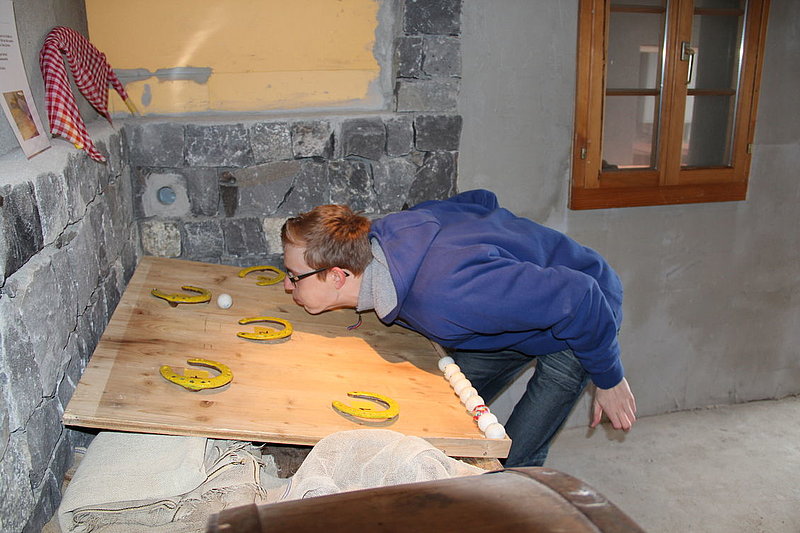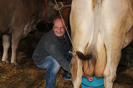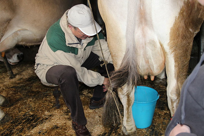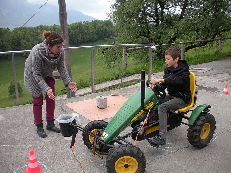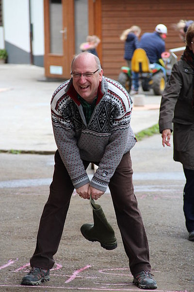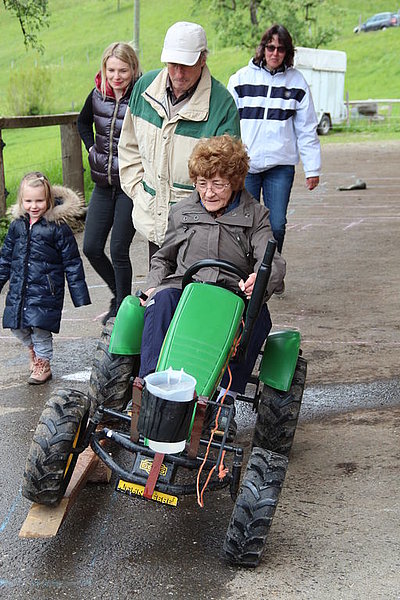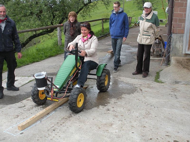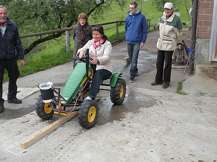 Il tempo un po' freddo a causa di un leggero vento del nord non ci ha impedito di divertirci nello svolgimento delle diverse discipline come getto "anomalo" dello stivale, difficili manovre con trattore (a pedali), labirinto a specchio e così via. La disciplina più impegnativa si è rivelata la mungitura. Due mucche (con corna), Musi e Severina, si son messe pazientemente a disposizione anche di coloro che fino a quel momento avevano visto mucche solo da lontano. Più punti faceva chi riusciva, dopo una breve istruzione, a mungere in un minuto più di 100 grammi di latte. Mica facile davvero! Nel secchio della maggior parte dei "Neumelcher" dopo un minuto non c'erano che al massimo 40 grammi scarsi.