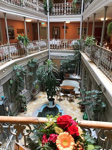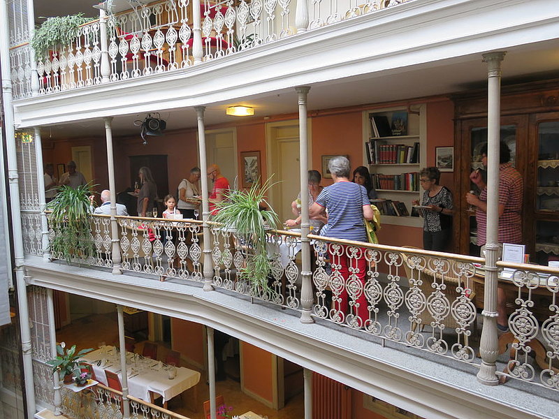 Dopo più di due ore la visita alla città è terminata giù nella zona dei bagni termali (dove dopo più di dieci anni sono finalmente iniziati i lavori del progetto Botta) e più precisamente con un generoso aperitivo nello spettacolare atrio dell’Hôtel Atrium Blume.