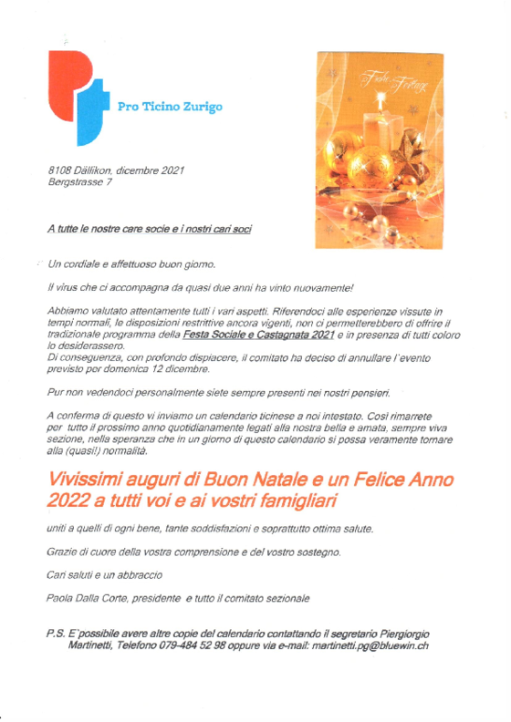 A conferma di questo vi inviamo un calendario ticinese a noi intestato. Così rimarrete per tutto il prossimo anno quotidianamente legati alla nostra bella e amata, sempre viva sezione, nella speranza che in un giorno di questo calendario si possa veramente tornare alla (quasi!) normalità.