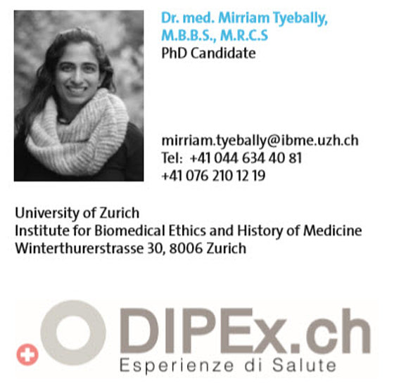 DIPEx mira a sostenere le persone che affrontano specifiche esperienze sanitarie, condividendo online le storie e la saggezza di altre persone che l'hanno sperimentato prima di loro . Il concetto di DIPEx ha avuto origine a Oxford ed è stato replicato in diversi Paesi. È stato ritenuto una risorsa utile sia per i pazienti che per il personale sanitario. Anche se speriamo di stabilire DIPEx anche qui in Svizzera, vorremmo assicurarvi che non ci sono pressioni per far parte di questo sito web se scegliete di partecipare al progetto di ricerca.