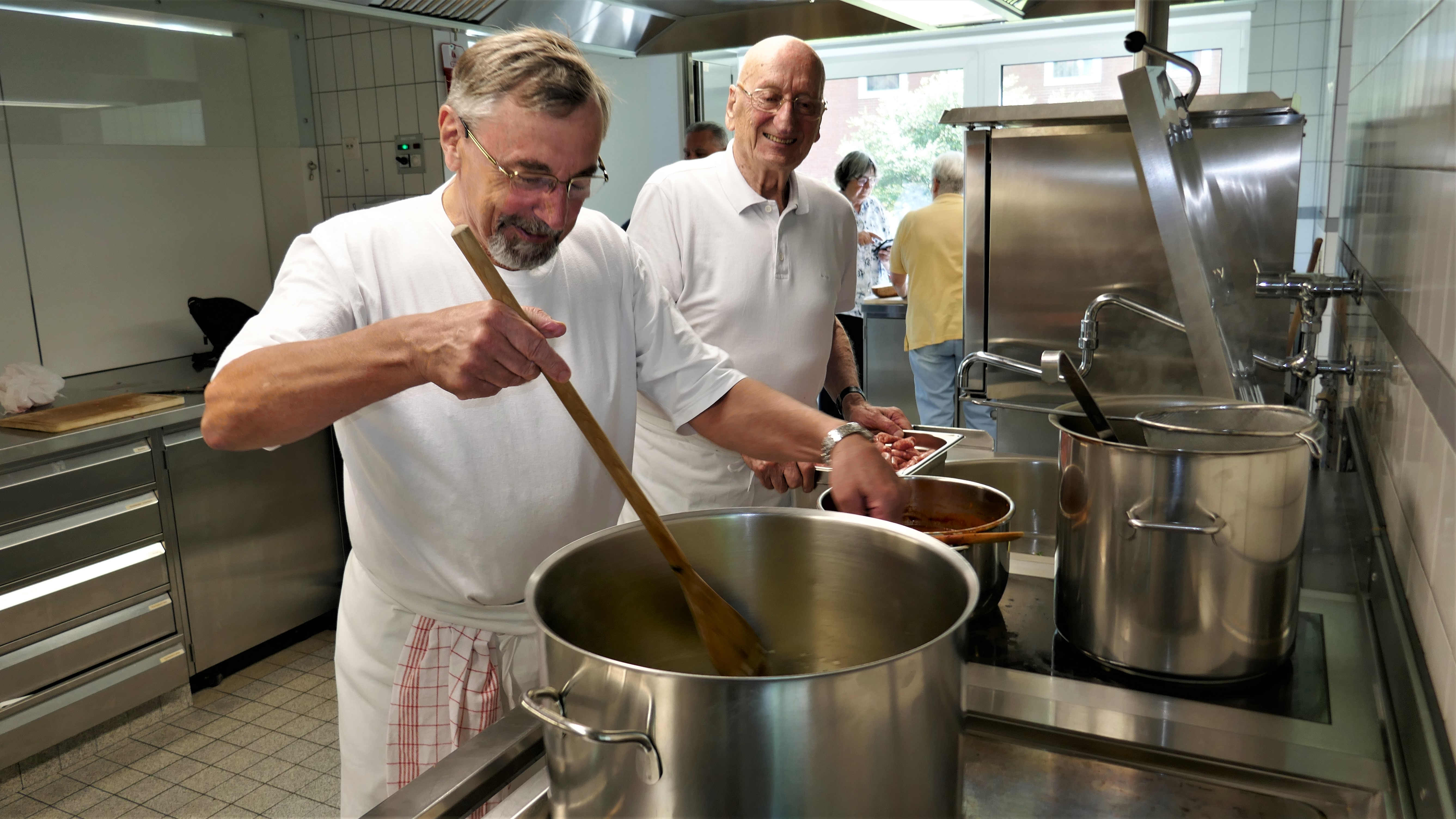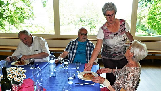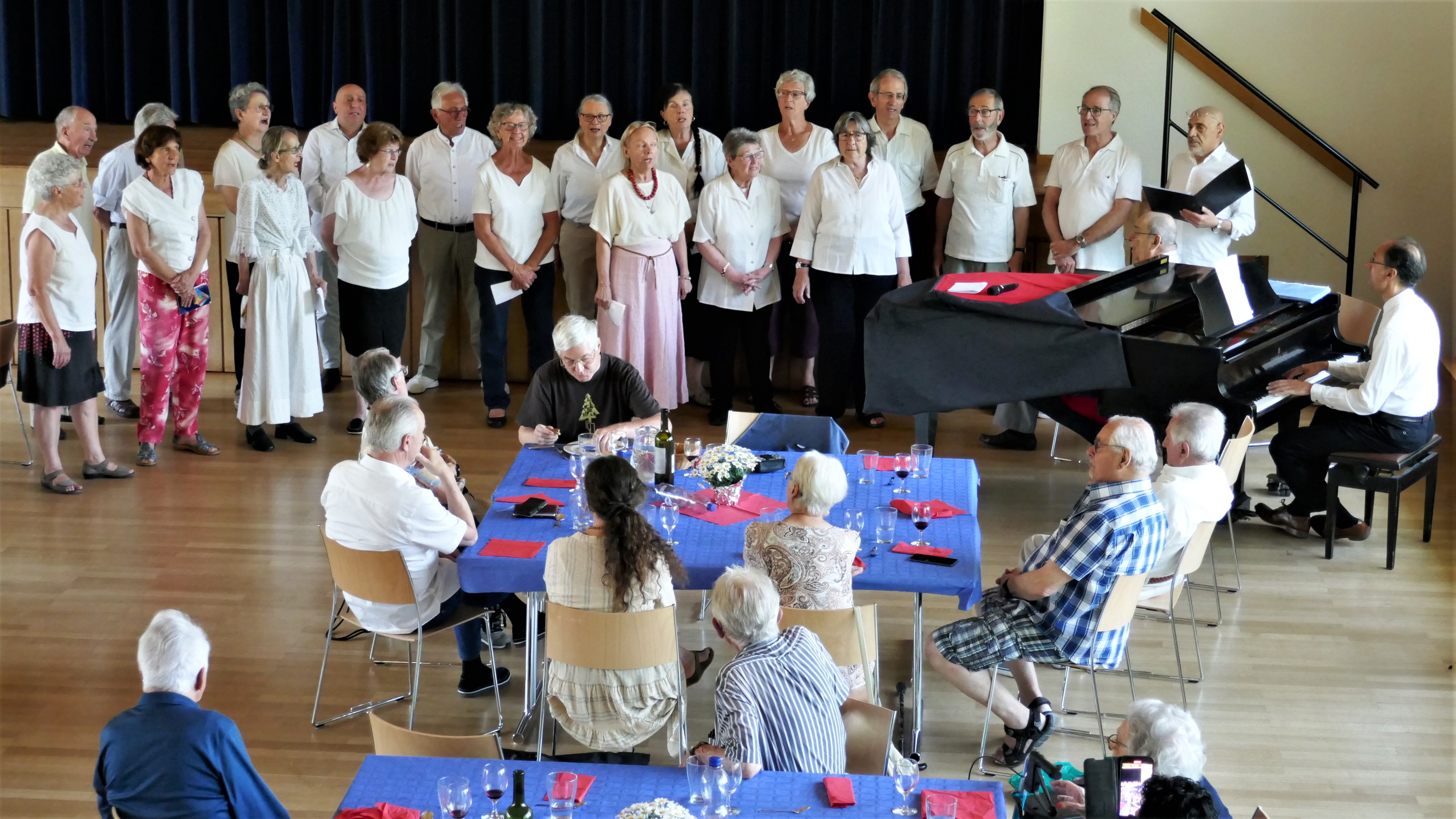E’ stato un pranzetto coi fiocchi quello offerto mercoledì 15 giugno dalla Sezione Signore, nel salone della Thomaskirche. Ad approfittarne, una cinquantina di socie e di soci, tutti o quasi rigorosamente sopra i sessanta (chi più, chi meno). Cucinato da Gianni e Arnoldo, il menu comprendeva: insalata mista, risotto ai funghi con luganighetta al sugo, gelato e torta! Dopo il pranzo: il cordiale saluto ai presenti da parte di Elisa e della nostra Presidente, Paola. Successivamente si è esibita con grande professionalità la Corale, accompagnata al pianoforte dal maestro Giancarlo Prossimo. Tornati finalmente a cantare dinanzi ad un pubblico dopo la pausa pandemica, coriste e coristi hanno riscosso calorosi applausi. Battimani anche per il gruppo CanSona, esibitosi con un bouquet di canti nostrani. Il simpatico raduno si è chiuso con un Quiz su temi prettamente ticinesi, vinto da Piergiorgio e Gabriella, che hanno così dimostrato di conoscere a fondo realtà e storia del nostro cantone d’origine. Un grazie di cuore quindi a Elisa e alla sua squadra per queste ore trascorse con cibi gustosi, in allegria e in sana compagnia.